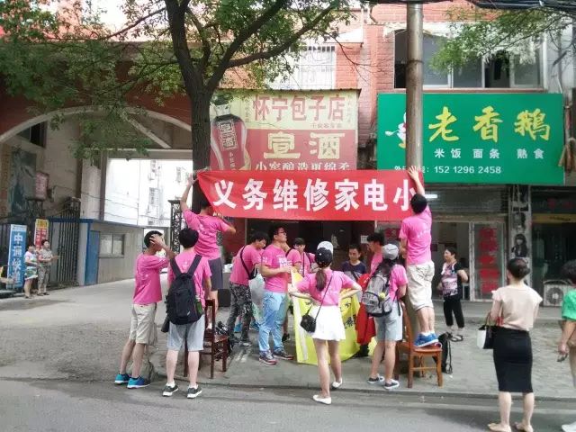 在文昌街道建設(shè)社區(qū)黨總支書(shū)記方愛(ài)玉的幫助下,師生們?cè)谏鐓^(qū)門口擺放好桌椅和維修工具,拉起義務(wù)維修家電的條幅,今天他們將要發(fā)揮大學(xué)專業(yè)所學(xué),幫助社區(qū)的居民維修家用小電器、電腦等,實(shí)地開(kāi)展調(diào)查,宣傳安全用電。