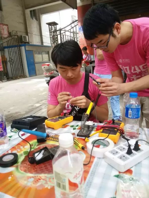 社區(qū)的居民拿來(lái)了很多損壞的熱水壺和電風(fēng)扇,安徽理工的學(xué)生拆開(kāi)電器用萬(wàn)用表測(cè)量電壓檢查電器出現(xiàn)的問(wèn)題。